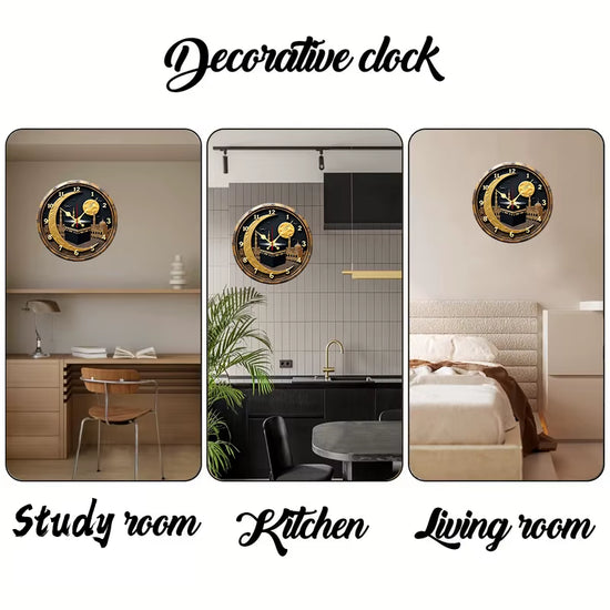 Black & Golden Kaaba Wooden round Silent Hanging Wall Clock, Suitable for Living Room,Office,Study Room,Bedroom, Home Decoration