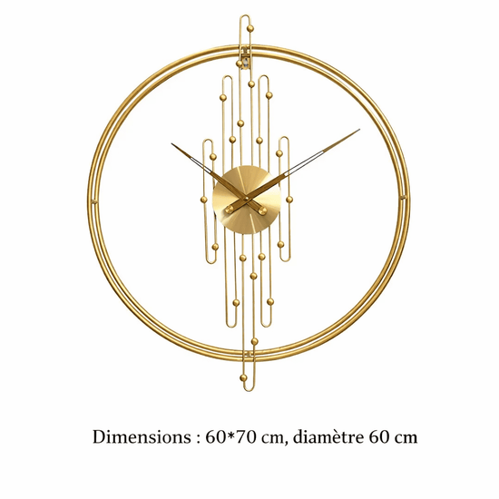 Avec des dimensions pouvant atteindre 60 cm par 70 cm, cette horloge habille majestueusement les grands espaces muraux. Son design en fer forgé doré ou noir s'adapte parfaitement aux intérieurs modernes, scandinaves ou industriels, offrant un contraste saisissant et une esthétique épurée.