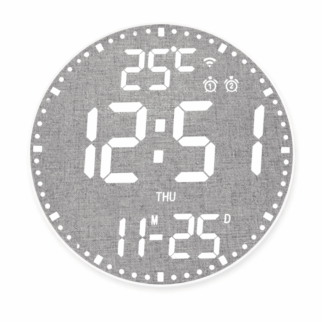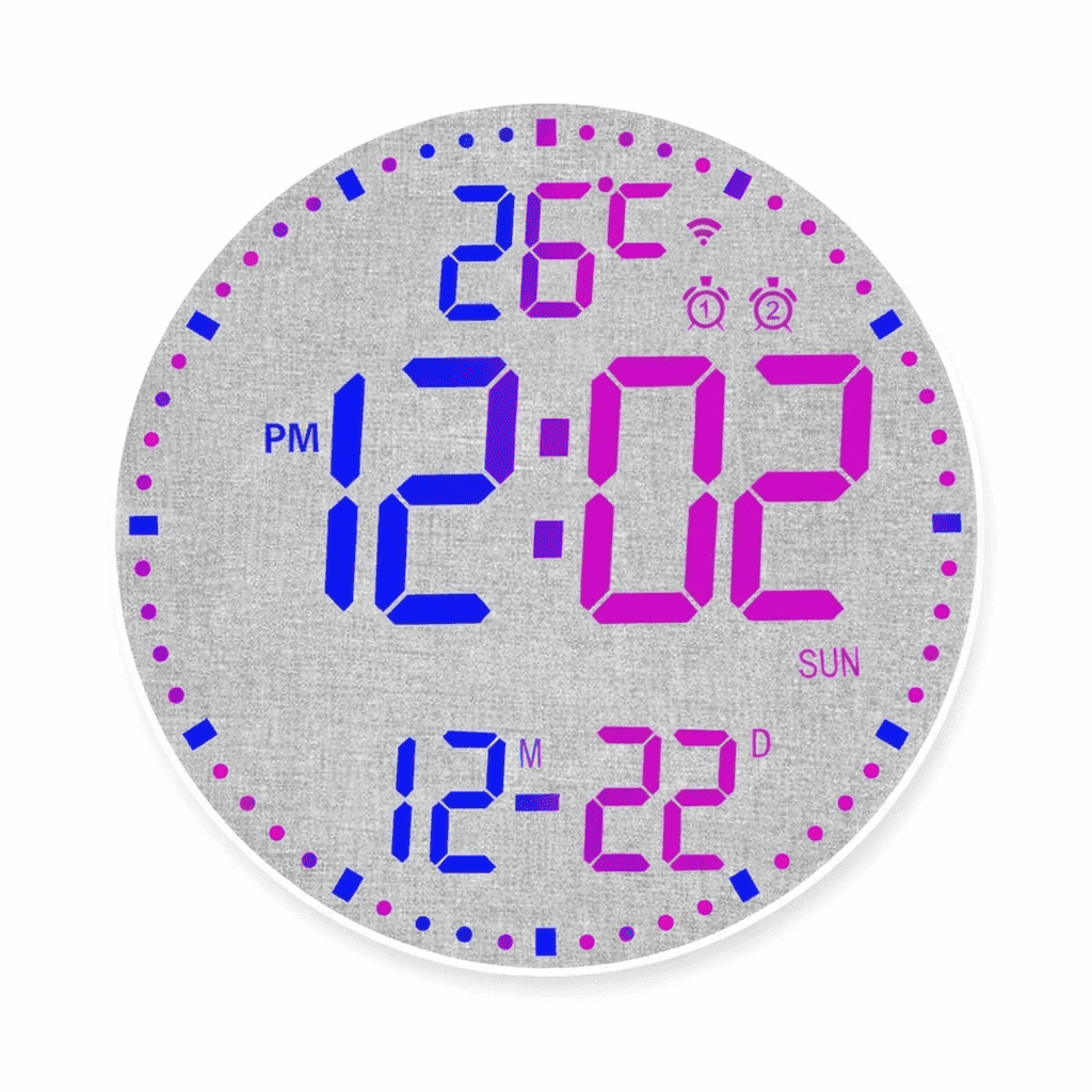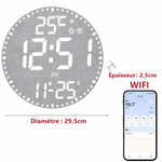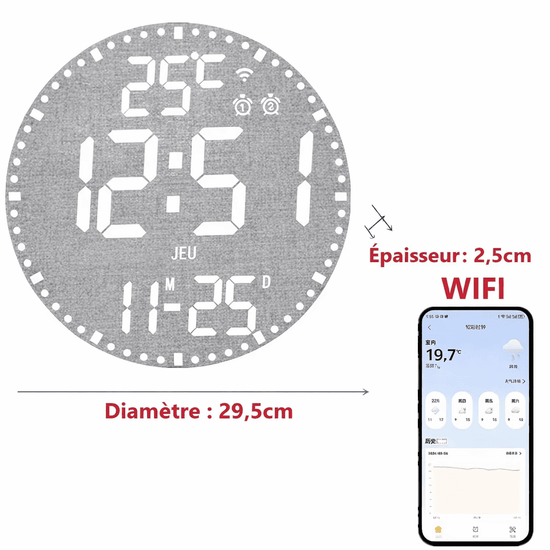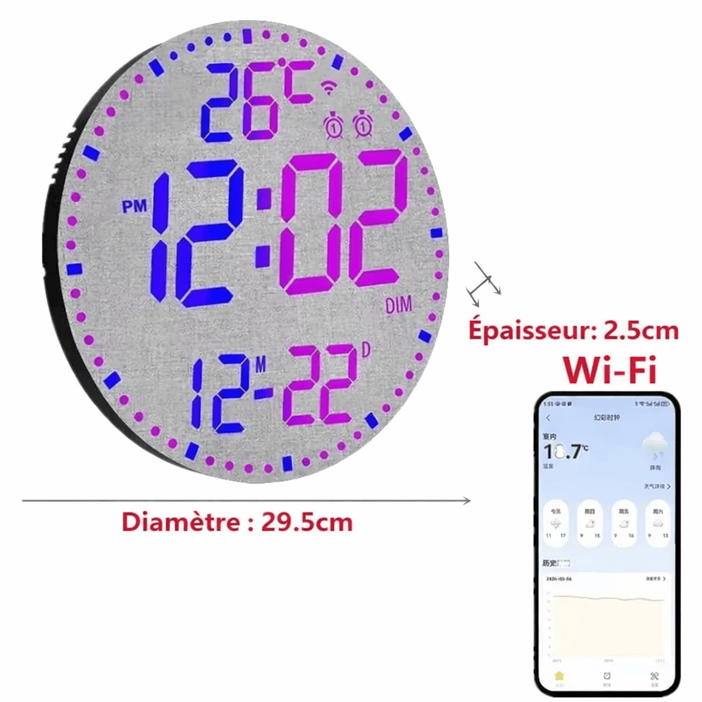 Donnez vie à vos murs avec le système RGB 12 couleurs. Que vous souhaitiez une ambiance zen en bleu, énergique en rouge ou un cycle multicolore dynamique, vous pouvez tout piloter depuis votre téléphone. Son grand cadran de 29,5 cm de diamètre offre un affichage LED limpide, protégé par une coque noire élégante qui s'adapte à tous les intérieurs modernes, du loft industriel au bureau minimaliste.